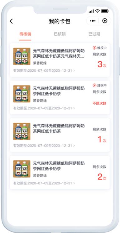 商家创建计次时商品,如健身卡、景区门票等,会员购买商品后生成核销卡,进行核销使用。